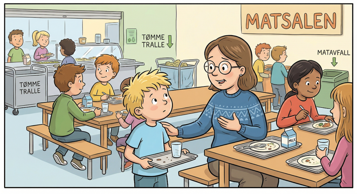 Det var lille Sverres aller første skoledag. Da det var tid for lunsj, satt frøken ved samme bord som elevene i matsalen.