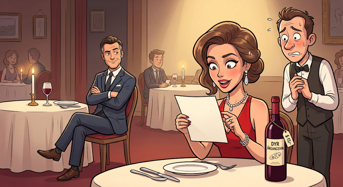 Han kaller til seg kelneren, stikker diskret en seddel i lomma hans og ber ham servere henne restaurantens dyreste vin med hilsen fra ham.