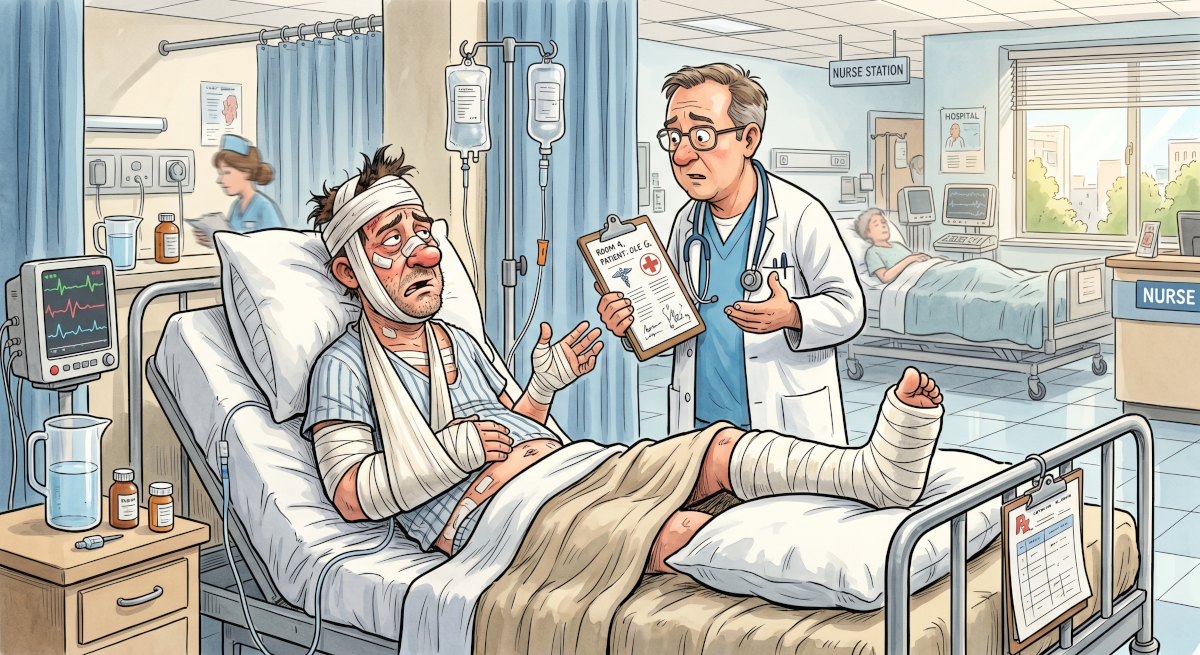 Under morgenrunden på sykehuset stopper legene ved en seng. En av dem leser i journalen: